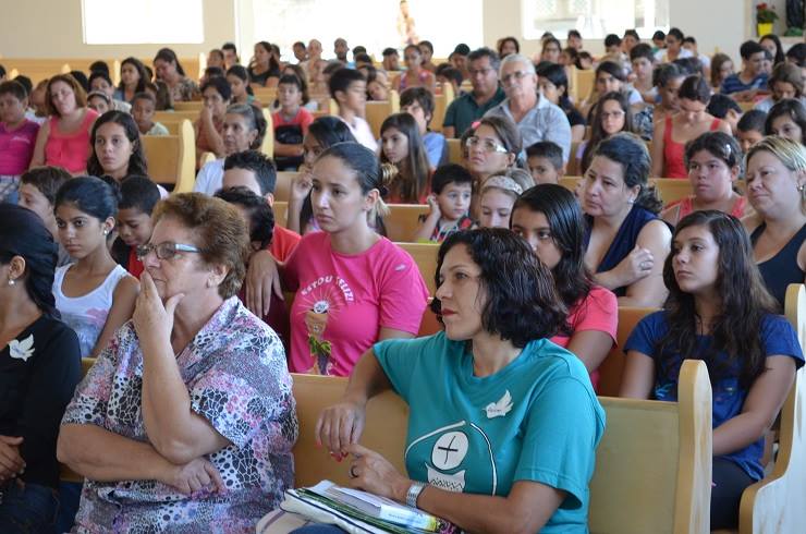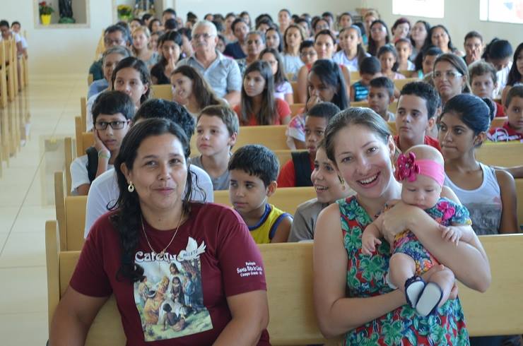 Neste sábado(08/03/14), às 8:00 horas da manhã, o Pe. Sérgio Coldebella, a coordenação da Catequese, Catequistas e Irmãs Pastorinhas celebraram abertura Oficial da Catequese na Matriz Santa Rita, com a presença aproximada de mais 400 pessoas. Em um momento Celebrativa o Pe. Sérgio, e a Coordenação da Catequese acolhe os Pais e Catequizandos na Igreja Matriz. Após as boas vindas a todos foi apresentado uma dinâmica que levou os catequizandos e familiares a refletirem sobre o medo que todos nós temos em participar das atividades da Igreja. Após apresentação dos Catequistas iniciou a Catequese de Iniciação a Vida Cristão.