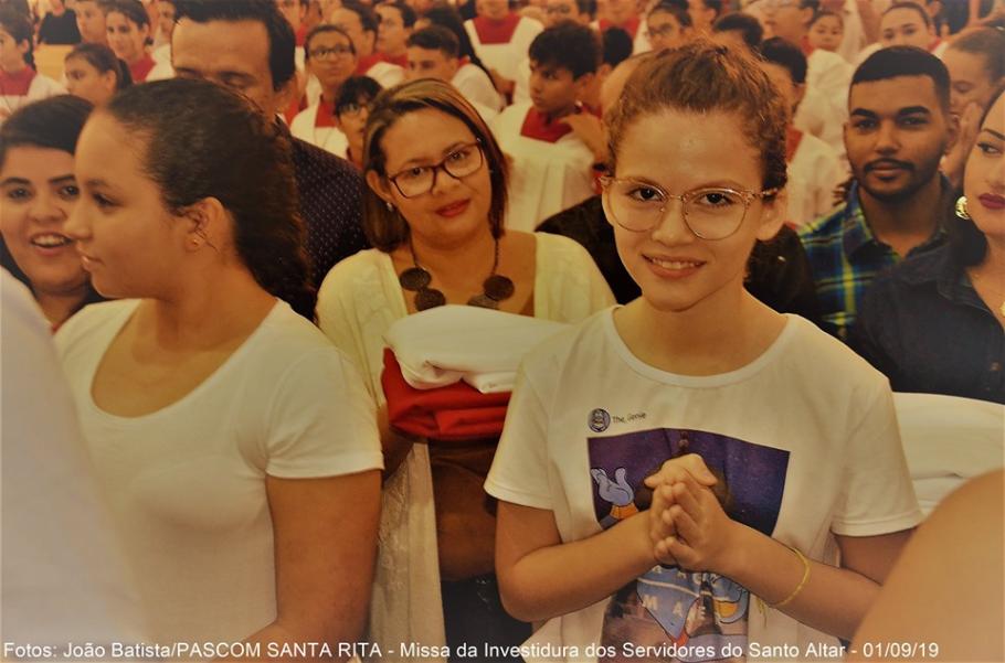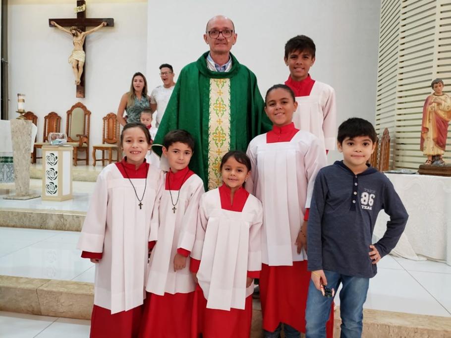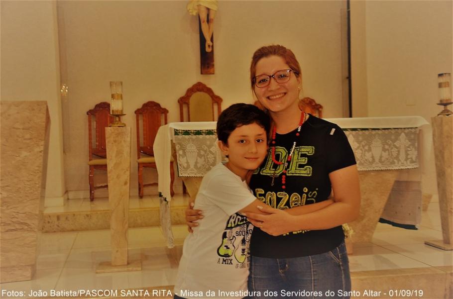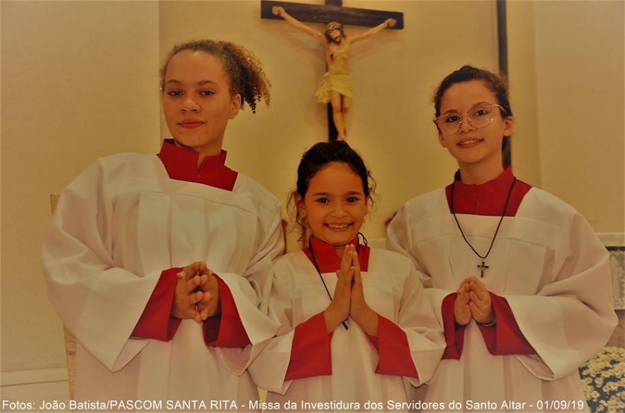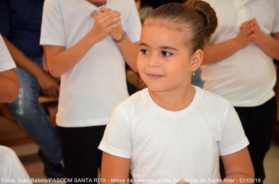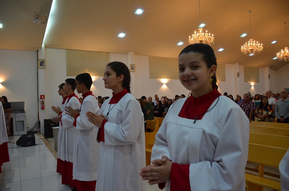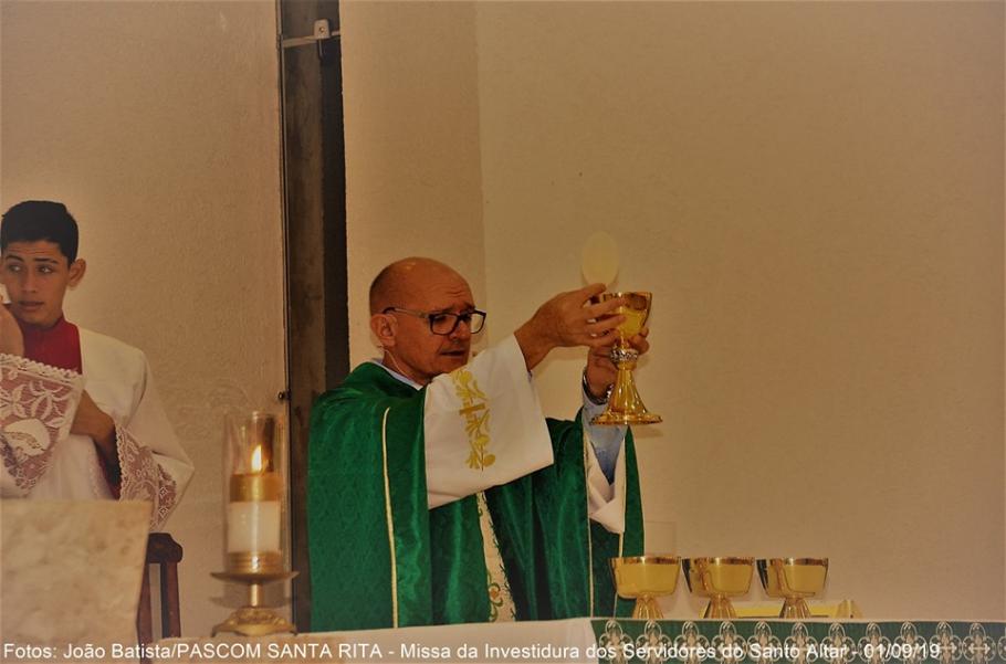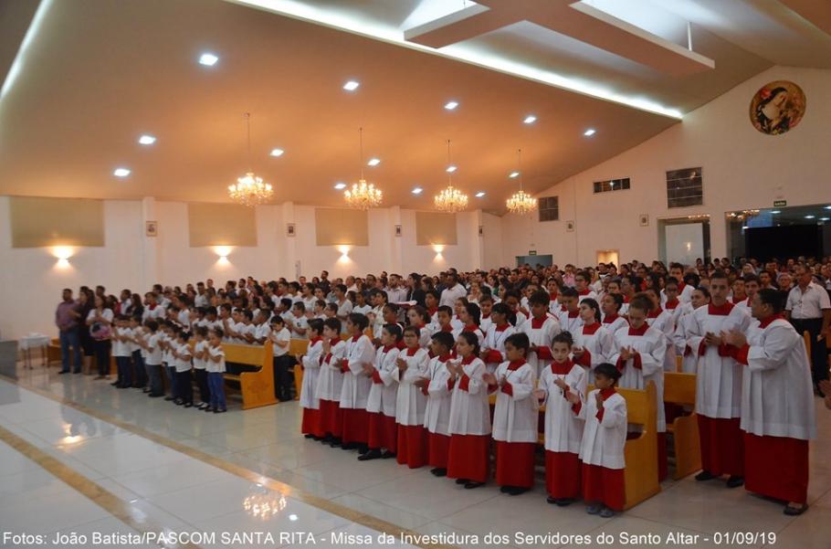 Neste domingo, (01/09/2019), às 18h30min., a Santa Missa, presidida pelo Pe. Sérgio Coldebella, pároco da paróquia Santa Rita de Cássia. Durante a Santa Missa o Pe. Sérgio apresentou, abençoou e investiu os novos Servidores do Santo Altar da Paróquia Santa Rita de Cássia, na presença dos pais, padrinhos e familiares dos novos Servidores e demais convidados presentes na celebração. Foram investidos 37(trinta e sete) novos Servidores do Santo Altar, crianças e adolescentes da Matriz Santa Rita e de suas Comunidades.