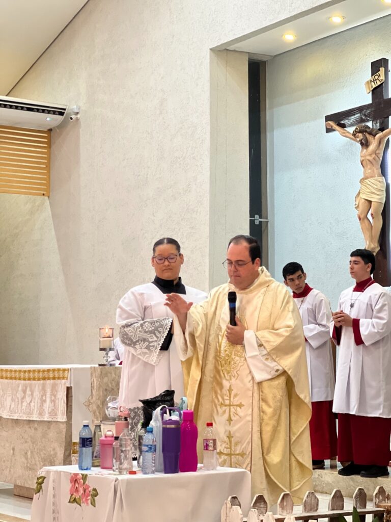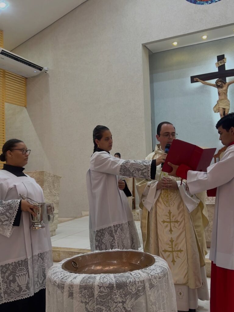 A celebração foi marcada pela Bênção das Águas, realizada na pia batismal, recordando o mistério do Batismo do Senhor e renovando em cada fiel a consciência da própria vocação batismal. Em seguida, as águas abençoadas foram aspergidas sobre o povo, como sinal de purificação, vida nova e compromisso renovado com Cristo.