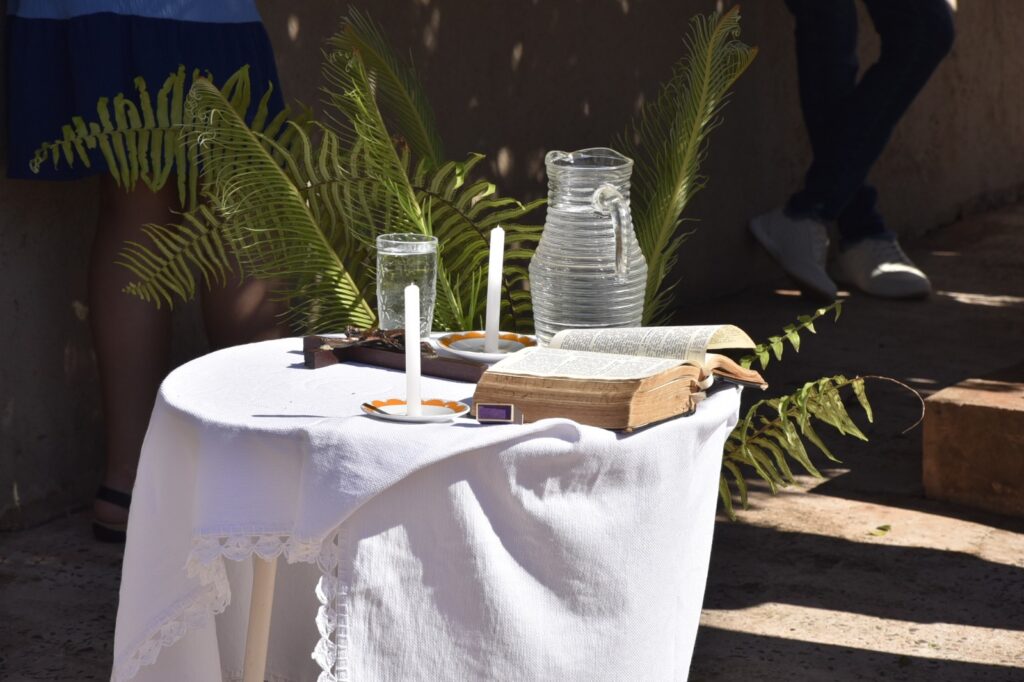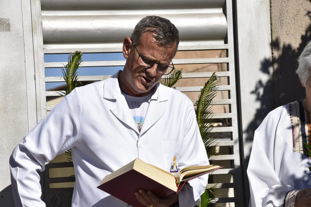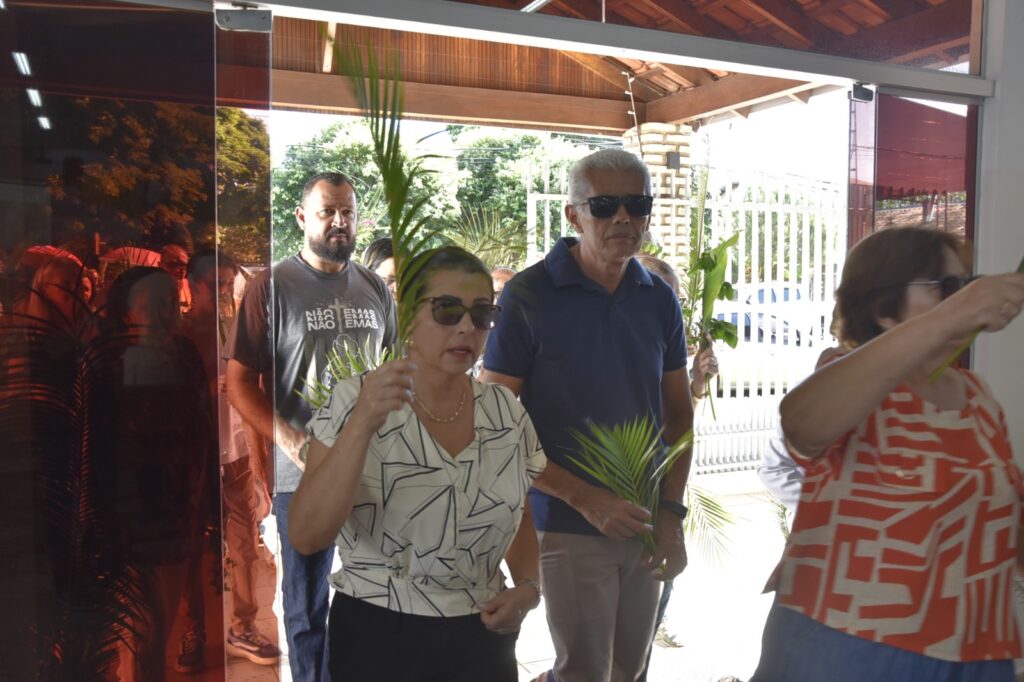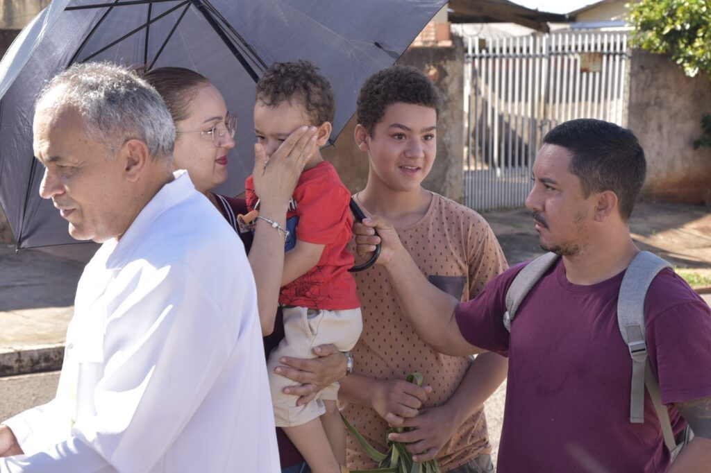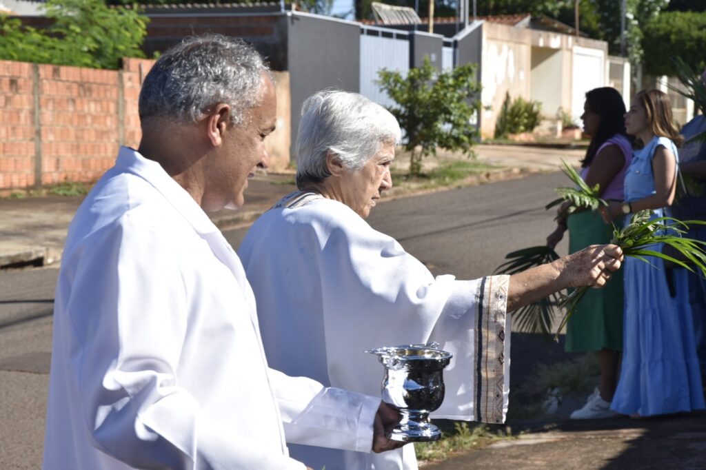 A concentração dos fiéis aconteceu em frente à casa da Dona Maria, viúva do saudoso Senhor Geraldo, um dos fundadores da comunidade. Ali, em clima de grande comoção e memória agradecida, iniciou‑se a celebração com a bênção dos ramos e a proclamação do primeiro Evangelho, recordando a entrada triunfal de Jesus em Jerusalém, aclamado pelo povo como Rei e Salvador.