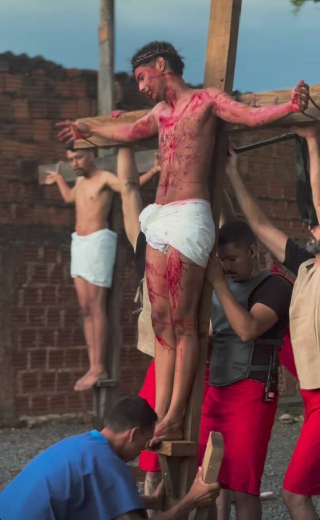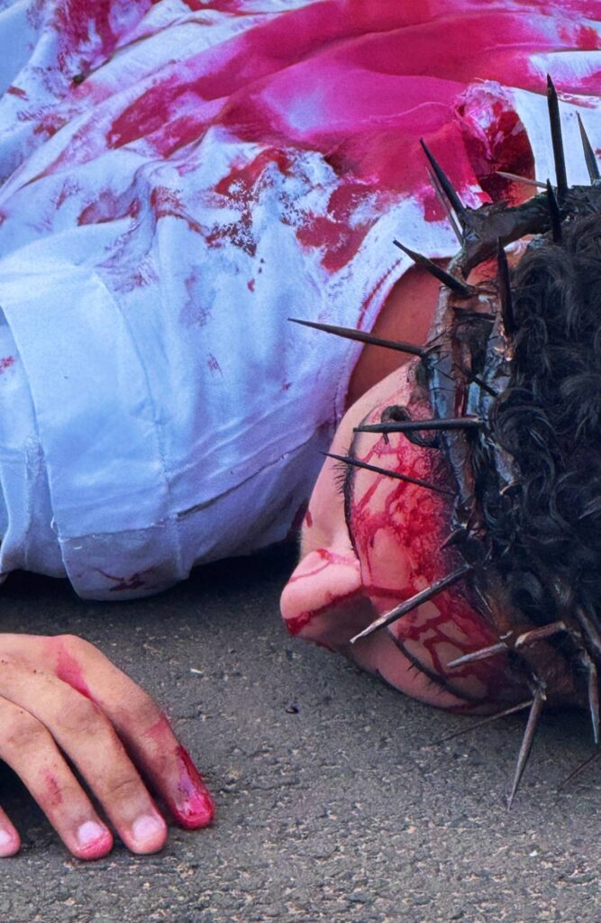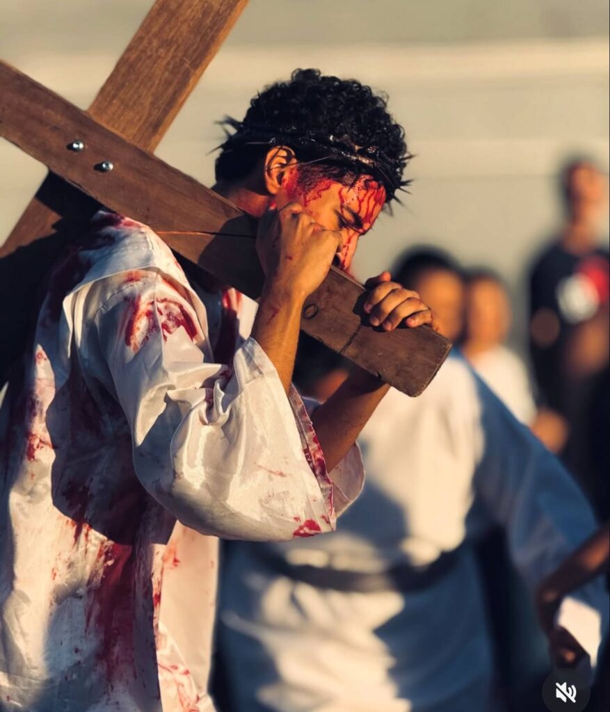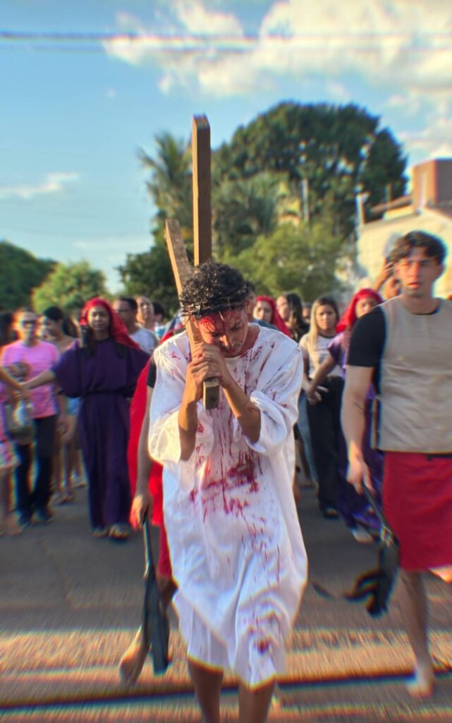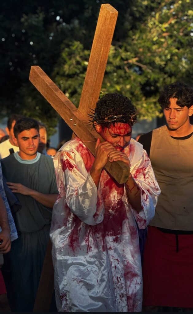 Em seguida, a Via‑Sacra, preparada com zelo pela juventude paroquial, percorreu as ruas do Bairro Universitário, convidando todos a acompanhar, passo a passo, o caminho de Jesus rumo ao Calvário. Cada estação foi vivida com profunda piedade, culminando na encenação da Crucificação, momento de intensa emoção e silêncio orante, que tocou profundamente o coração dos presentes.